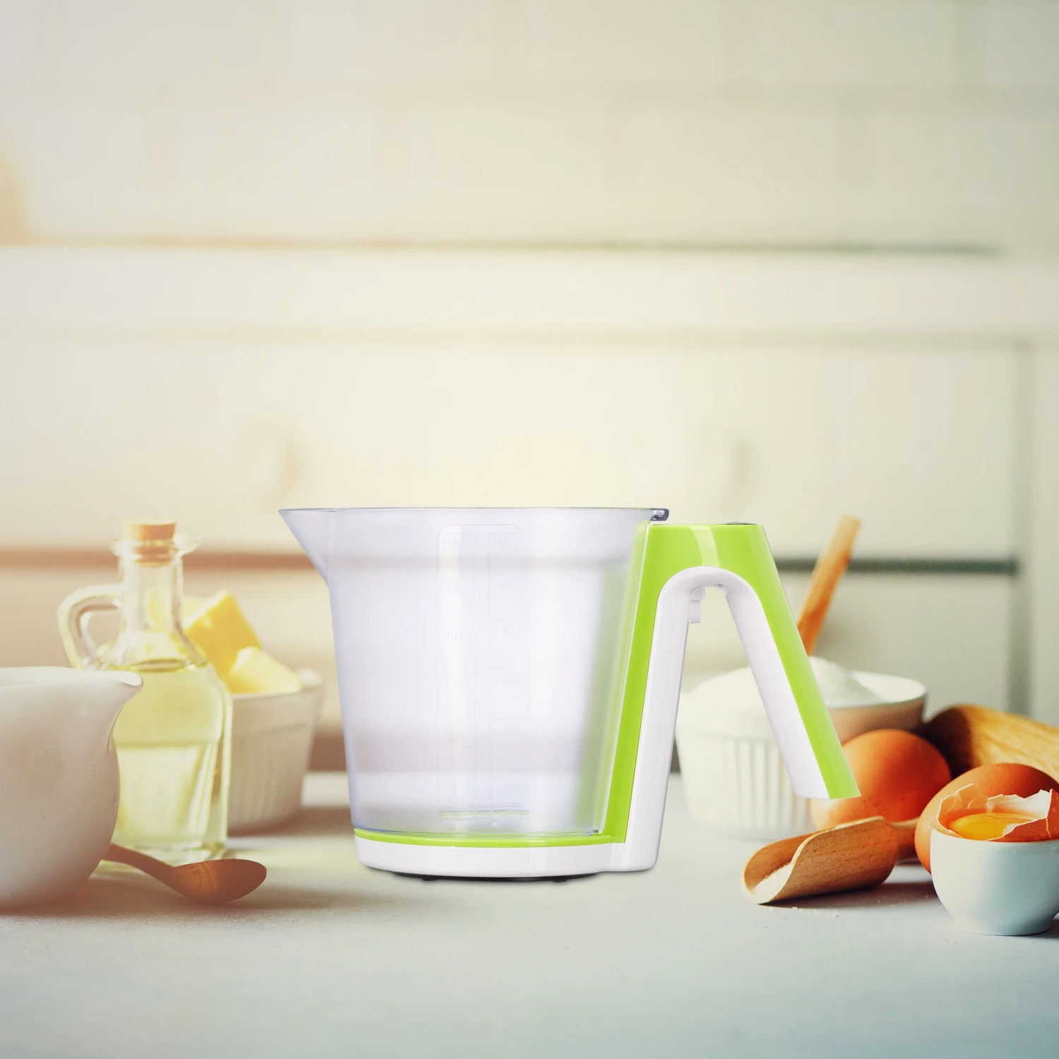 Mit diesem praktischen Küchenhelfer macht Backen und Kochen noch mehr Vergnügen. Der Messbecher ist in eine digitale Waage integriert und gibt grammgenaue Ergebnisse in verschiedenen Maßeinheiten an. So können Sie ohne Umstände flüssige und feste Zutaten nacheinander abwiegen. Dank der Zuwiegefunktion können Sie den Messbecher bei verschiedenen Zutaten einfach auf der Küchenwaage stehen lassen. Über die Ausgießöffnung schütten Sie Flüssigkeiten ganz leicht um. Zur Reinigung lässt sich der Becher per Knopfdruck aus der Halterung lösen. Das LED-Display schaltet sich bei Nichtbenutzung automatisch ab.
