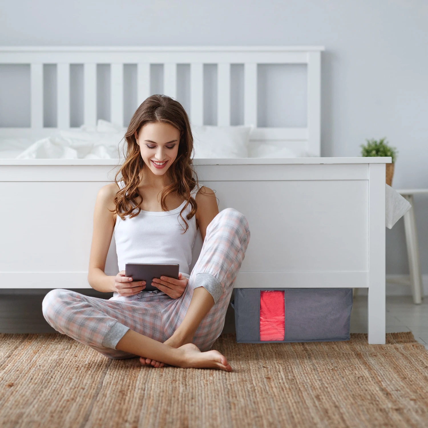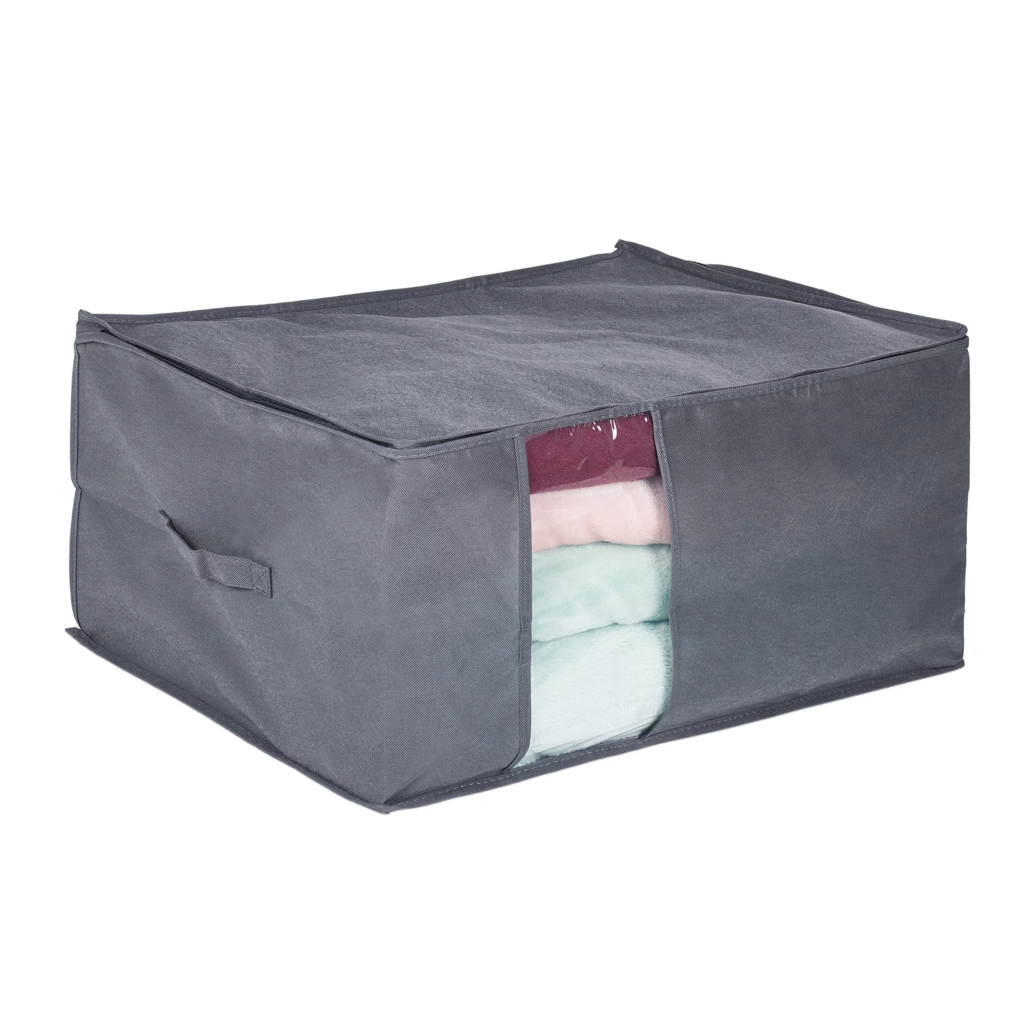 Mit dieser Wäscheaufbewahrung kannst Du den freien Platz unter Deinem Bett optimal ausnutzen. In der Unterbetttasche mit Reißverschluss kannst Du Kleidung und Handtücher oder Bettzeug wie Decken und Kissen platzsparend und ideal vor Staub geschützt lagern. Dank des transparenten Sichtfensters kannst Du den Inhalt jeder Zeit erkennen und brauchst nicht lange zu suchen. Die Deckentasche besitzt 2 Griffe, wodurch sie sich leicht unter dem Bett oder Kleiderschrank hervorziehen und tragen lässt.