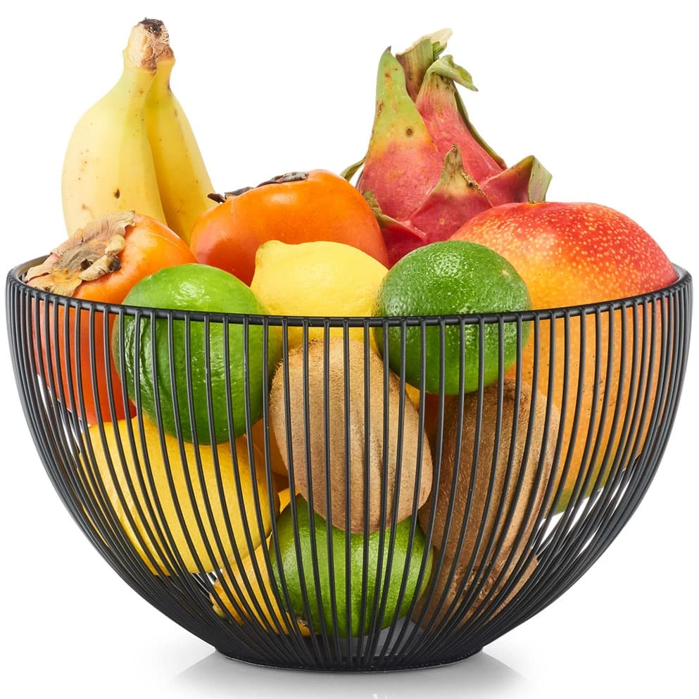 Der vorgestellte Drahtkorb wurde in Schwarz gefärbt, eine universelle und modische Farbe für Küchenzubehör, entworfen für stilvolle und elegante Küchen. Dieser moderne und geschmackvolle Obstbehälter ist aus strapazierfähigem, hygienischem Metall gefertigt, das auch in die neuesten Trends passt. Dekorative