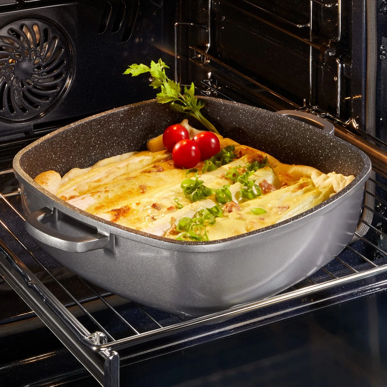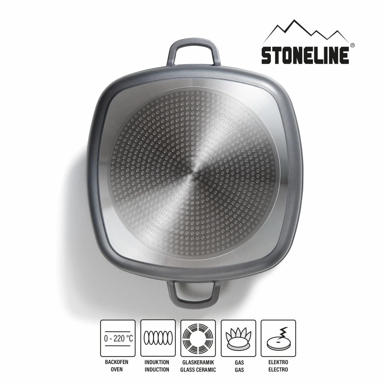Die Eckpfanne ist bis 220 °C backofengeeignet und mit der bewährten STONELINE® Antihaftbeschichtung ausgestattet.