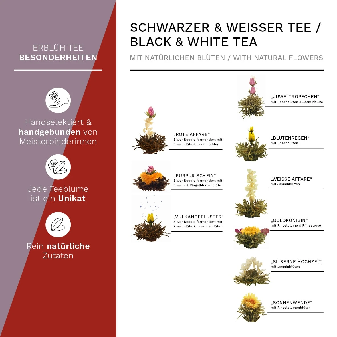 Der ErblühTee bietet dem Genießenden ein außergewöhnliches Erlebnis: Im Innern der Kugel befindet sich eine kunstvoll eingebundene exotische Blüte. Ihr Geheimnis entfaltet die Kugel aber erst, wenn sie in ein Gefäß mit kochend heißem Wasser gegeben wird. Sie beginnt sich langsam zu öffnen und bringt am Ende der Aufgussinszenierung die eingebettete Blüte hervor, die formenreich und farbenprächtig aus ihr emporsteigt. An diesem Tee ist fast alles Handarbeit. Nur wenigen so genannten Meisterbinderinnen ist es vorbehalten, die getrockneten Blätter des Weißen Tees zu einer Kugelform zu binden, denn das Wissen um diese seltene Kunst wird streng behütet. So bleibt der ErblühTee eine wertvolle Rarität Chinas.