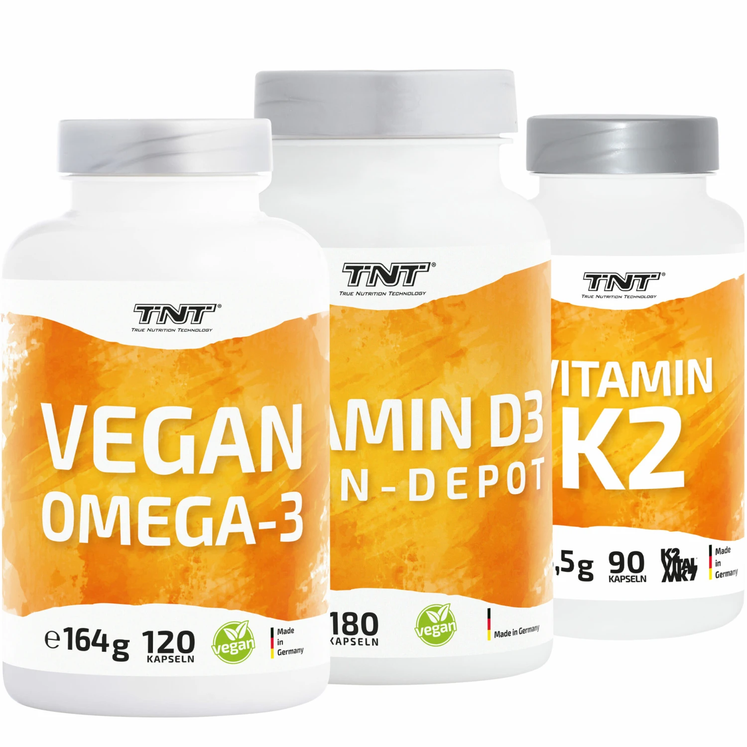 – Dieses Bundle besteht aus TNT Omega-3 Kapseln (120 Stück), TNT Vitamin D3 Vegan-Depot (180 Stück) und TNT Vitamin K2 (90 Stück).