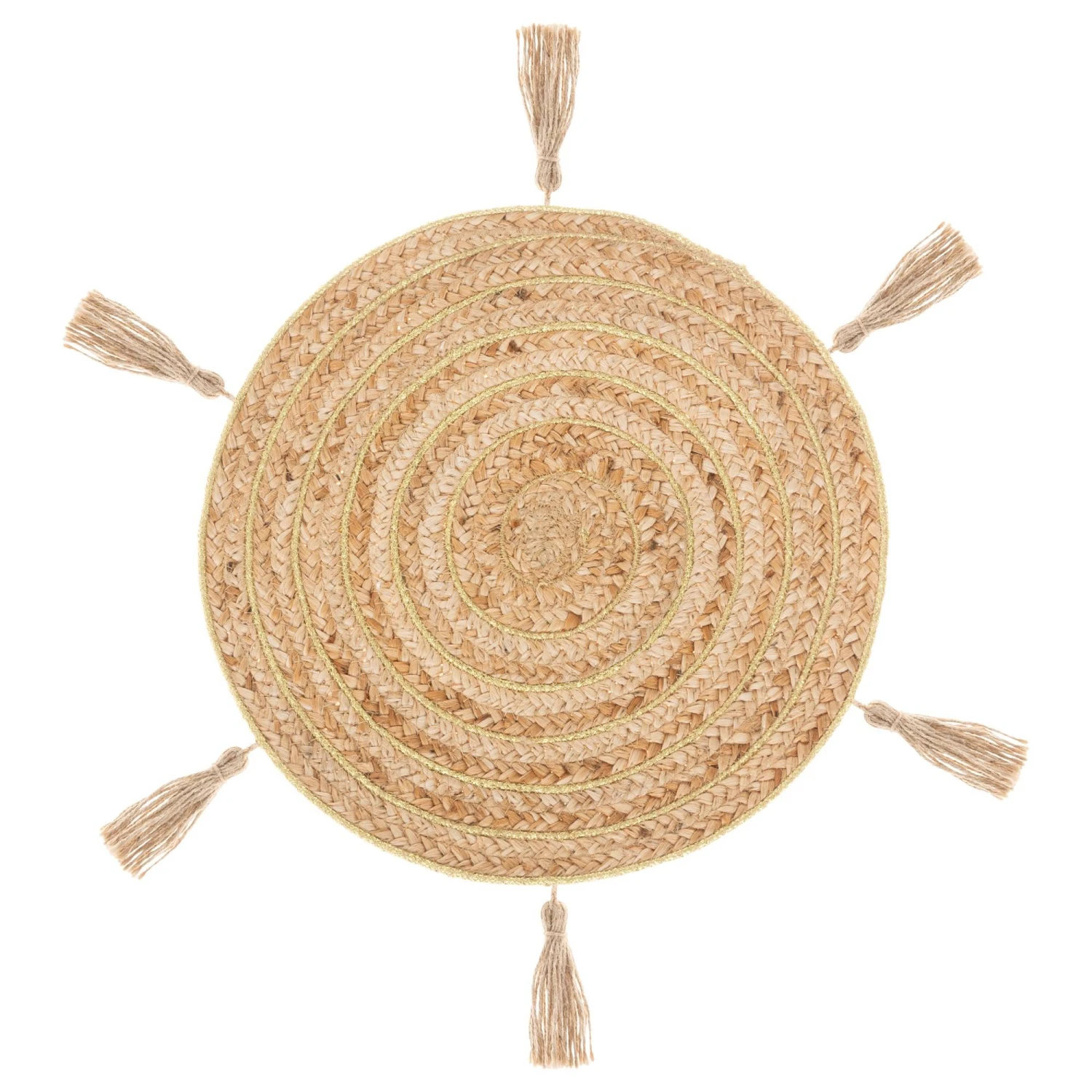 Die Maße der Matte betragen (Durchmesser) 38 cm. Das Pad hat eine Goldfadenverzierung, die sich wunderbar mit natürlicher Jute verbindet. Zusätzlichen Reiz verleihen Fransen, die ihm Leichtigkeit verleihen und das Bild ergänzen. Beige Färbung ist universell, was bedeutet, dass die Matte für praktisch jeden Anlass sowie aus dem Urlaub in Kombination mit einer Tischdecke aufgetragen werden kann. Dies erleichtert den Abstand der Teller und das Ausbreiten des Bestecks, wodurch Platz für ein Familienmitglied oder einen Gast geschaffen wird.