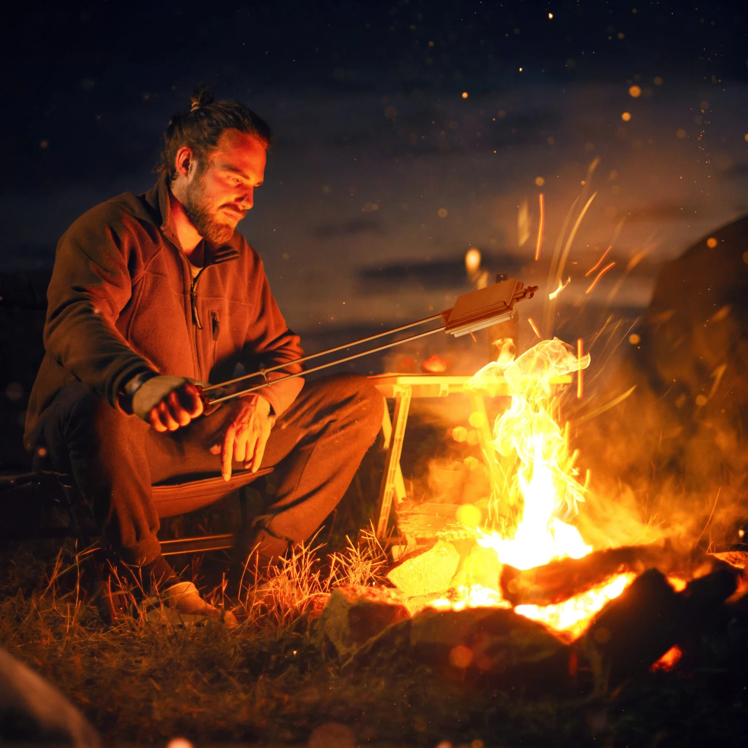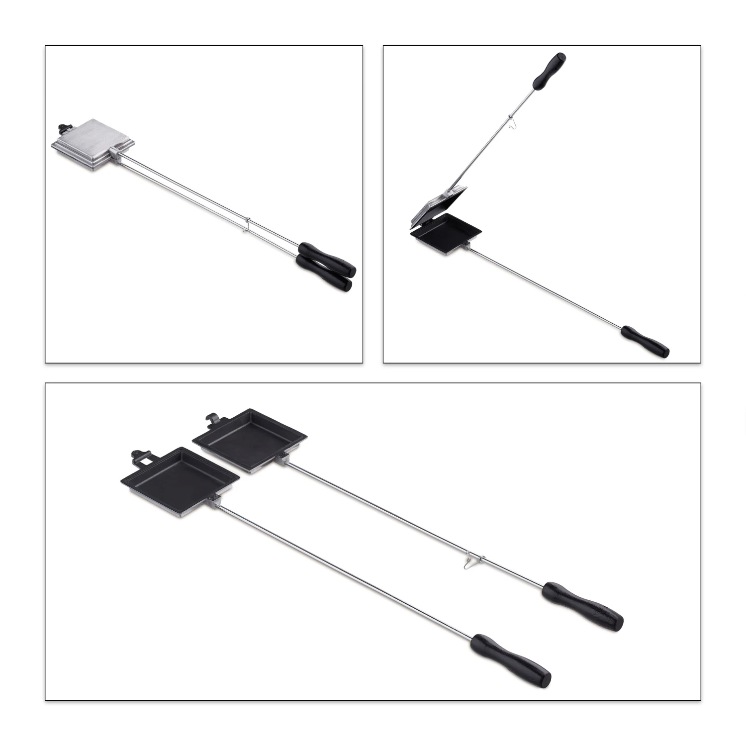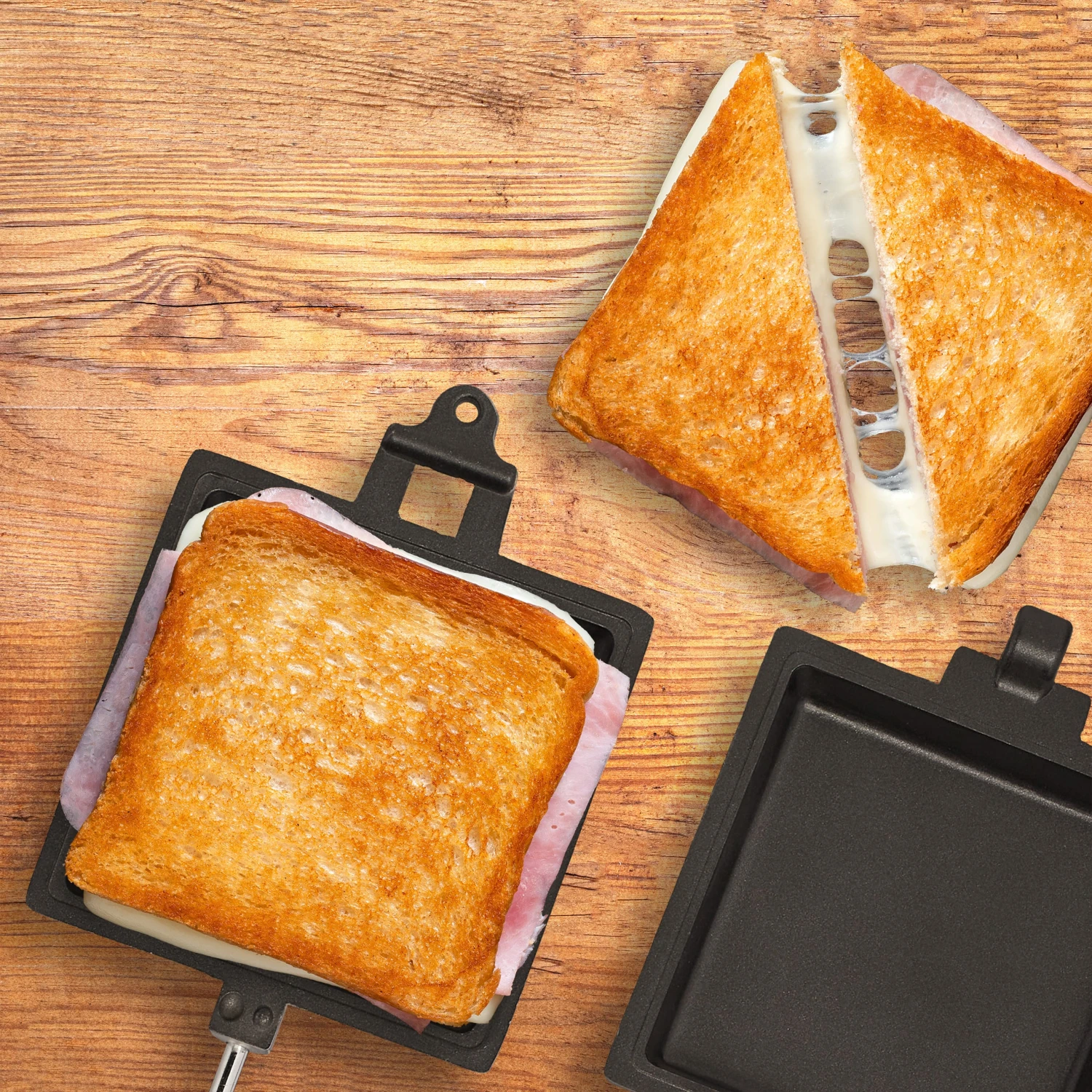 Ein leckerer, heißer Käsetoast, ein raffiniertes Sandwich oder eine süße Waffel beim Camping: All das ist mit diesem Sandwicheisen problemlos möglich. Durch den robusten Aluguss hält der Grilltoaster der Hitze von Lagerfeuer, Grills und Gaskochern stand. Mit einem Verschluss zum Einrasten und einem Haken am Ende des langen Griffs bleibt der Sandwichtoaster für die Dauer der Zubereitung gut verschlossen. Der lange Griff mit Holz schützt zudem vor Hitze und Verbrennungen.
