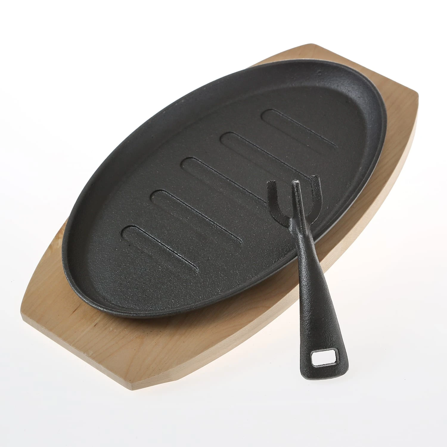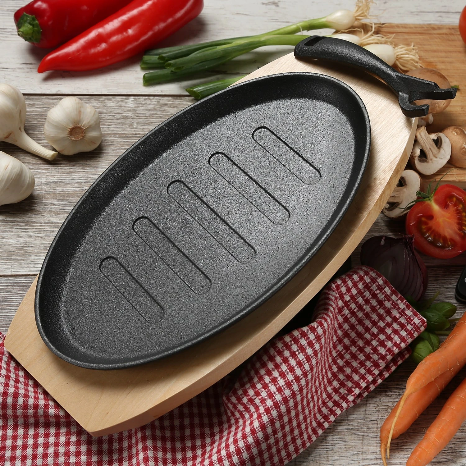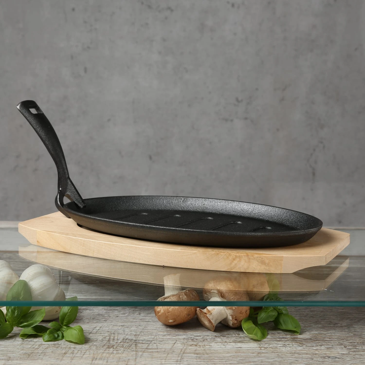 Gusspfanne mit abnehmbaren Stiel u. Holzuntersetzer – Gusseisen – L: 27cm – Servierpfanne – oval Kochen und Grillen am offenen Feuer wie es Menschen bereits seit Jahrtausenden tun – die ursprüngliche Art zu Kochen!