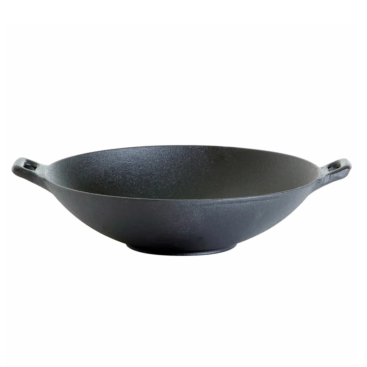 Wok aus Gusseisen – Wokpfanne mit 2 Griffen – D: 37cm Gusseisen ist ein perfekter Wärmespeicher und gibt die Hitze sehr gut an die Lebensmittel ab. Deshalb werden WOK Pfannen aus Guss gerne auf dem Grill eingesetzt. Nicht nur für traditionell asiatische Gerichte, also Kurzgebratenes, sondern auch gerne für Geschnetzeltes in Sahnesauce, Gemüsepfannen, Pilzpfannen etc.